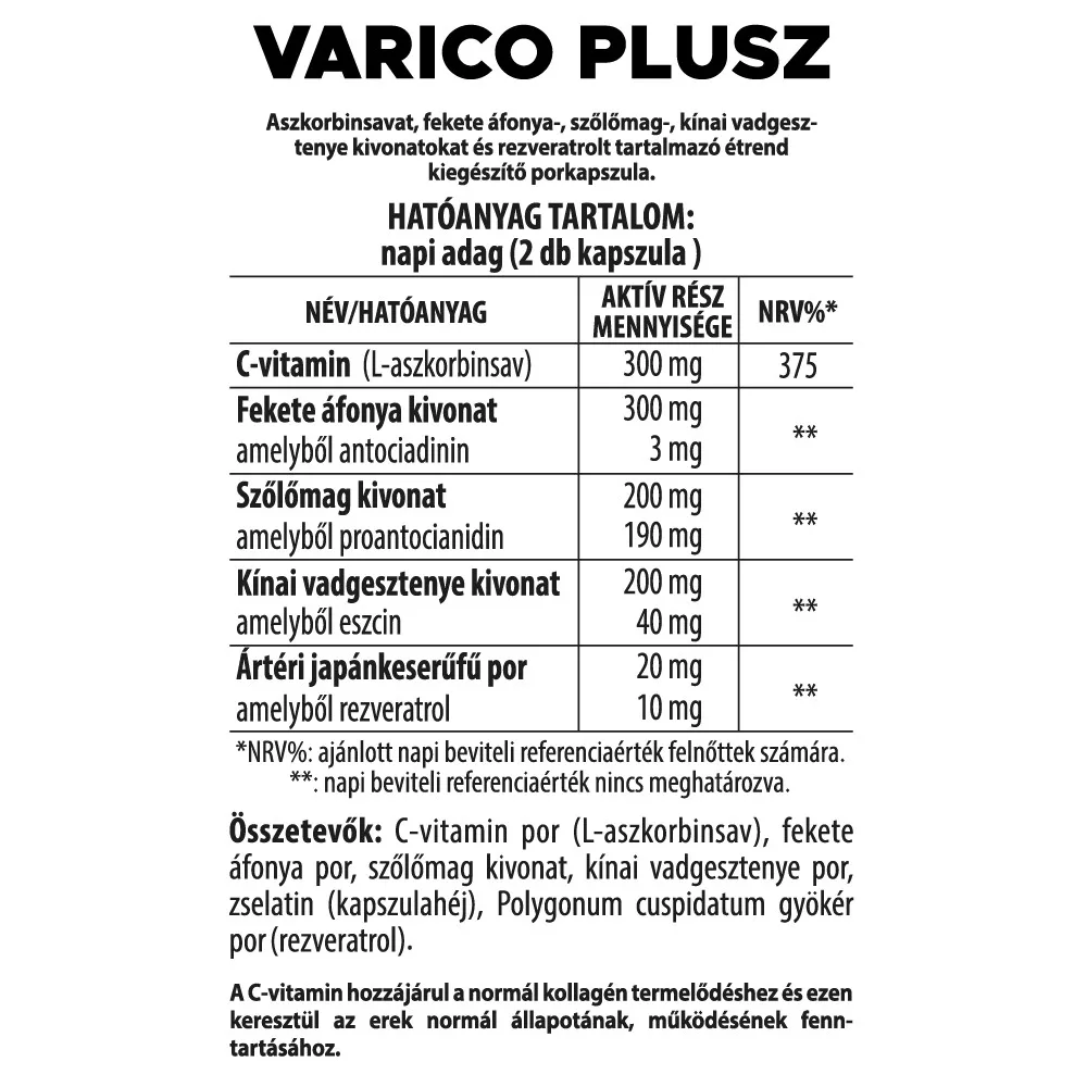 Összetevők: C-vitaminpor (L-aszkorbinsav), Fekete áfonya gyümölcs por kivonat, szőlőmag kivonat, kínai vadgesztenye por kivonat, zselatin (kapszulahéj), Polygonum cuspidatum gyökér por (rezveratrol).