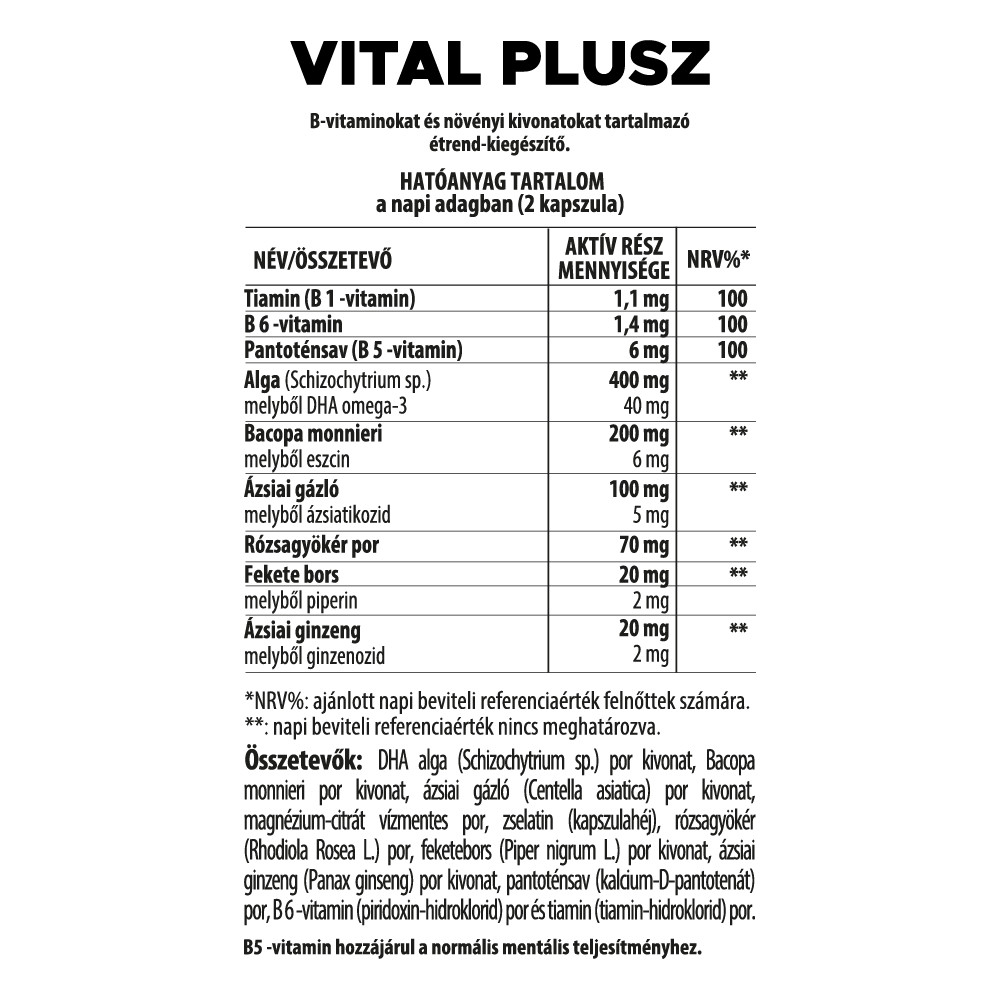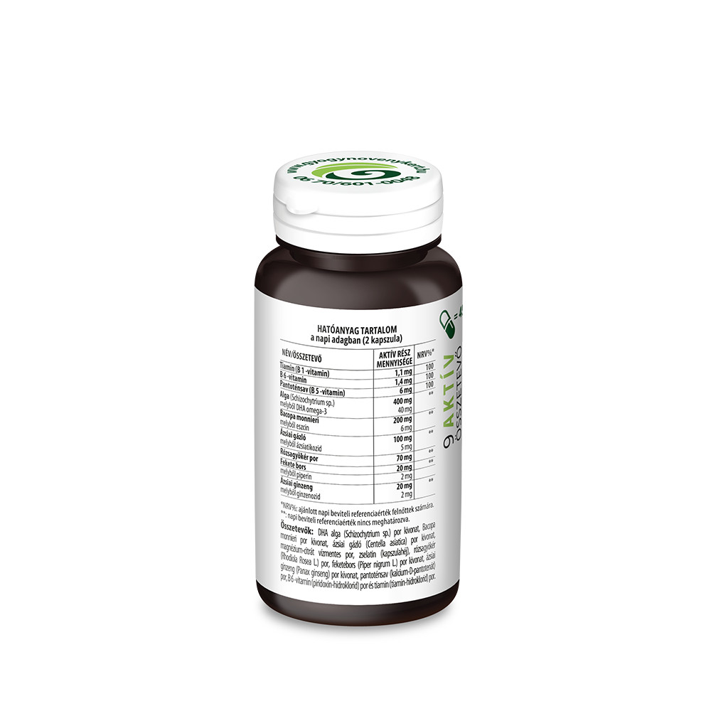 Összetevők: DHA alga (Schizochytrium sp.) por kivonat, Bacopa monnieri por kivonat, ázsiai gázló (Centella asiatica) por kivonat, magnézium-citrát vízmentes por, zselatin (kapszulahéj), rózsagyökér (Rhodiola Rosea L.) por, feketebors (Piper nigrum L.) por kivonat, ázsiai ginzeng (Panax ginseng) por kivonat, pantoténsav (kalcium-D-pantotenát) por, B 6 -vitamin (piridoxin-hidroklorid) por és tiamin (tiamin-hidroklorid) por.